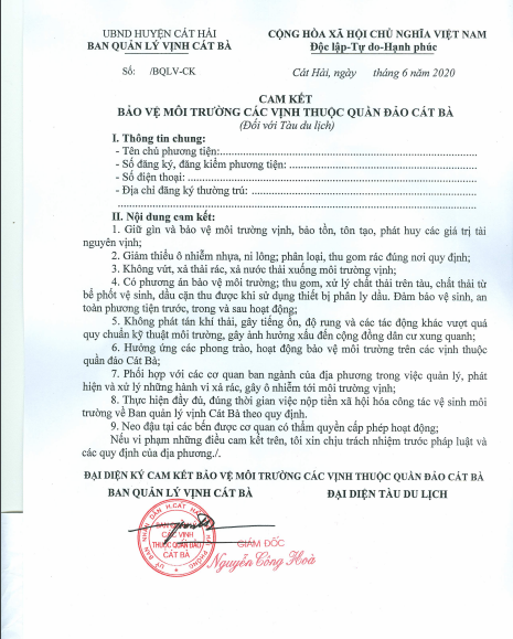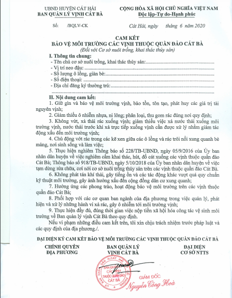 Cam kết bảo vệ môi trường các vịnh thuộc quần đảo Cát Bà đối với Cơ sở nuôi trồng, khai thác thủy sản và đối với tàu du lịch.