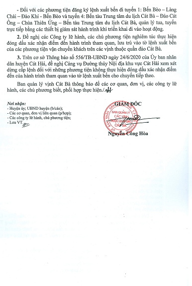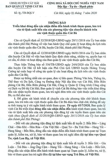 Thông báo về việc triển khai đóng dấu xác nhận điểm đến hành trình tham quan, lưu trú vào tờ lệnh xuất bến của các phương tiện vận chuyển khách trên các vịnh thuộc quần đảo Cát Bà