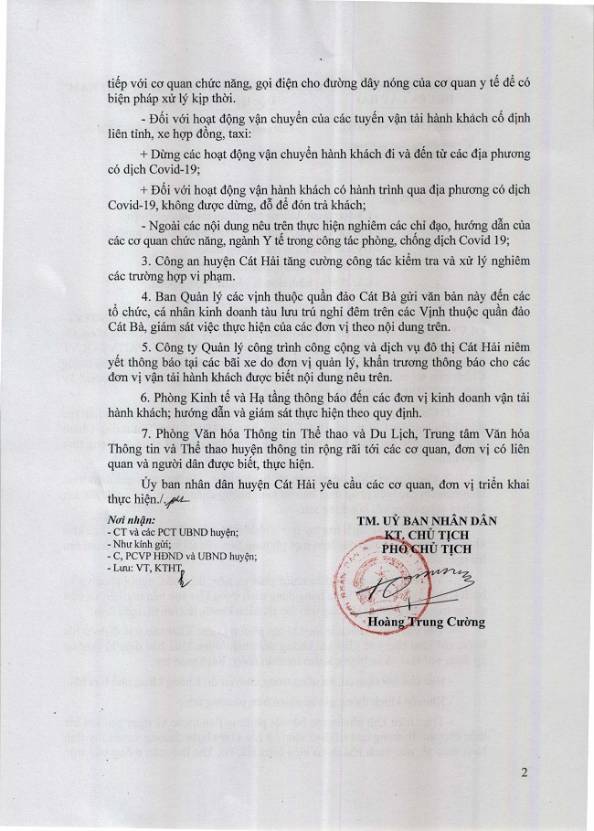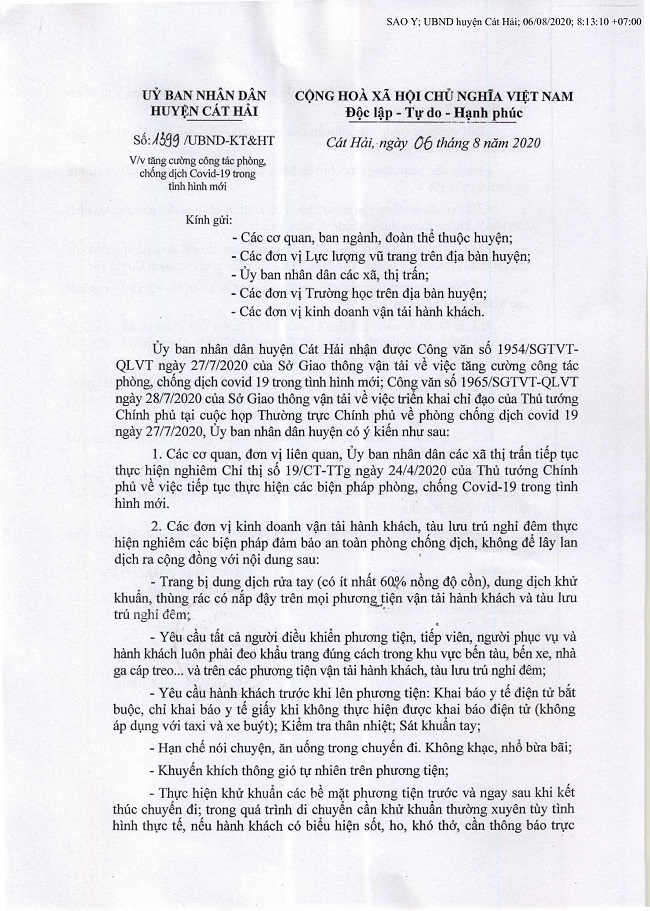 CV Số: 1399/UBND-KT&HT của Ủy ban nhân dân Huyện Cát Hải ngày 06/08/2020 về việc tăng cường công tác phòng, chống dịch Covid-19 trong tình hình mới.