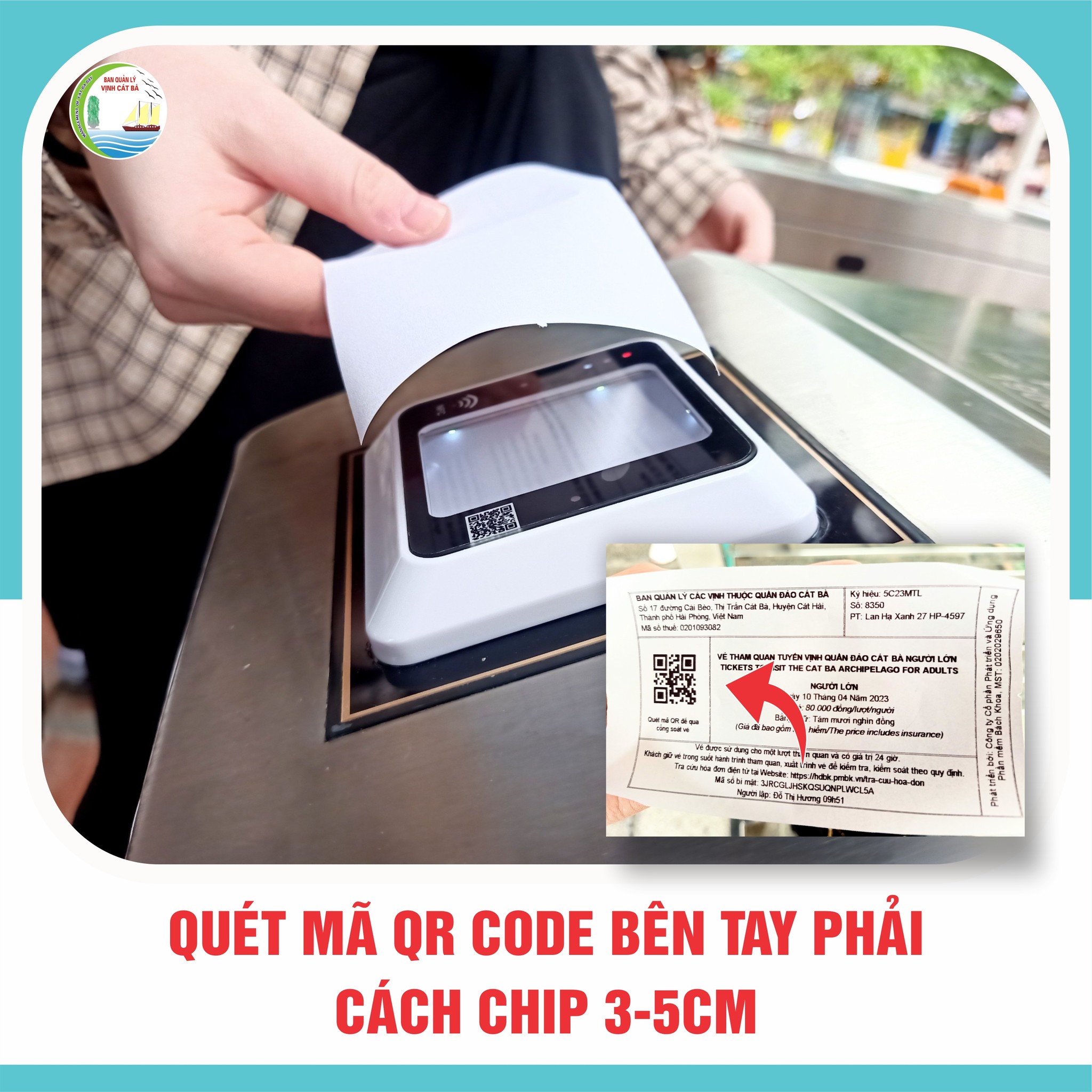 - Đến cổng kiểm soát quý khách đứng ở vạch chân, quét mã QR code bên tay phải, cách chip 3-5cm.