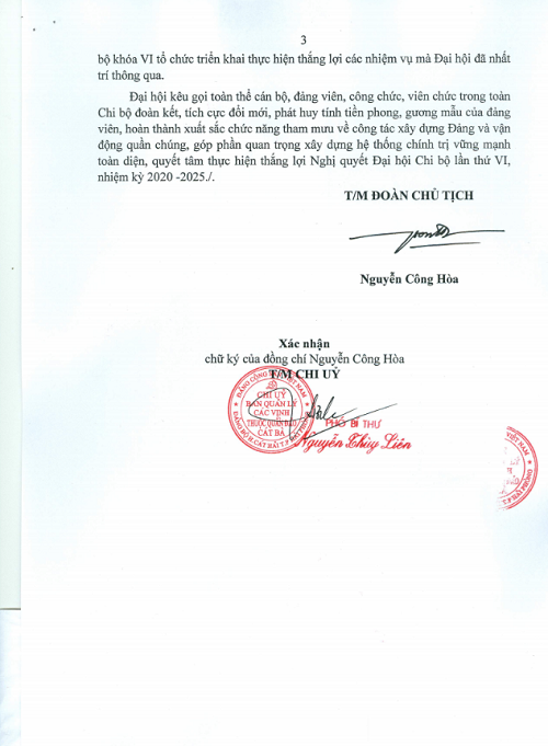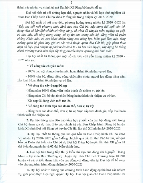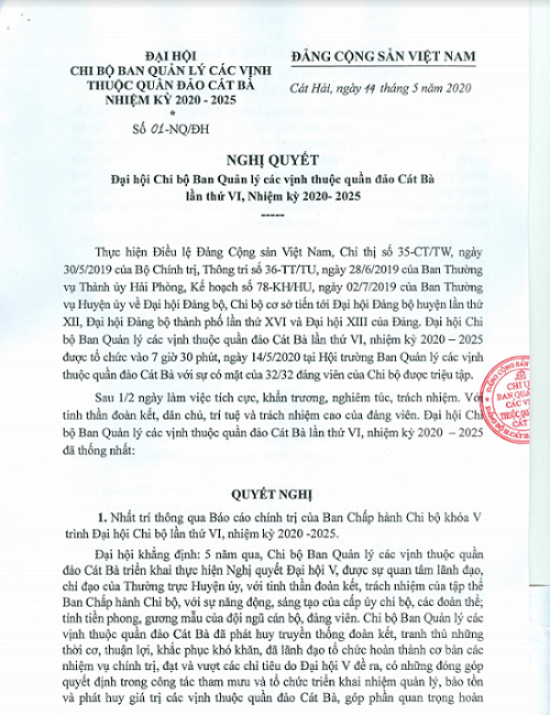 Nghị quyết số: 01-NQ/ĐH, Đại hội Chi bộ Ban quản lý các vịnh thuộc quần đảo Cát Bà lần thứ VI, nhiệm kỳ 2020 - 2025.